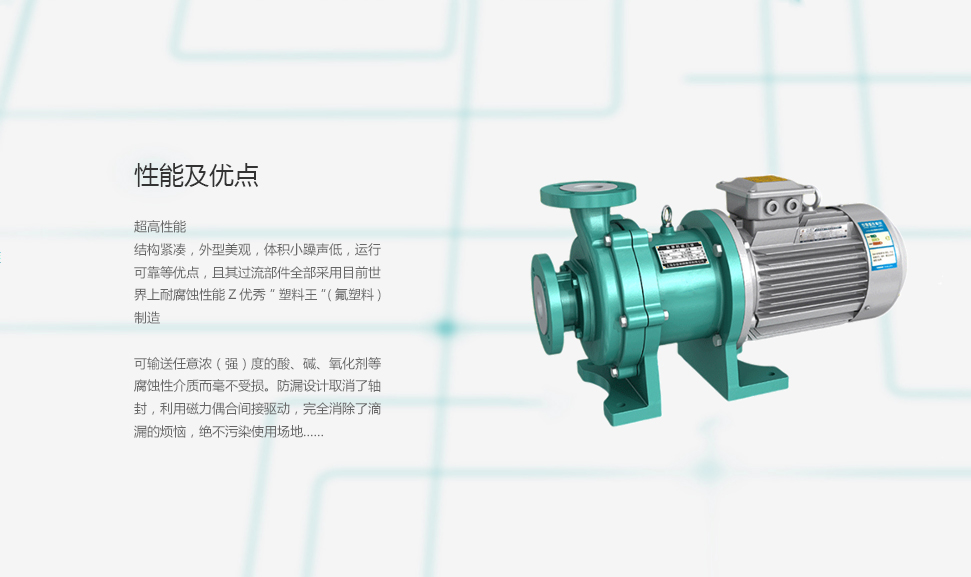 分類:目前國內(nèi)廠家生產(chǎn)的氟塑料磁力泵主要有:CQB型氟塑料磁力泵、ZMD氟塑料自吸式磁力泵 、IMD型氟塑料磁力驅(qū)動泵等。由于泵的過流部分選用“氟塑料合金”制造。可連續(xù)輸送任意濃度的酸、堿、強氧化劑等腐蝕介質(zhì)而毫不受損。CQB-F氟塑料磁力泵設計獨特,無須機械軸封,絕對不滲漏,液體過流部件選用氟塑料,陶瓷、氟橡膠等材料,泵體外殼用金屬材料固定,故泵體足以承托管道的重量,使用保養(yǎng)及為方便。